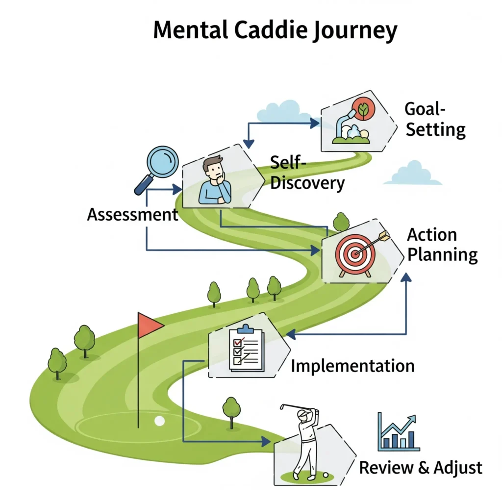 [Image Prompt: A flowchart-style visual showing the mental caddie journey: Assessment → Self-Discovery → Goal Setting → Action Planning → Implementation → Review & Adjust. Each step is illustrated with simple icons and connected by a winding path that resembles a golf course fairway.] Alt text: Visual mental caddie process flowchart showing self-discovery journey from assessment to achievement